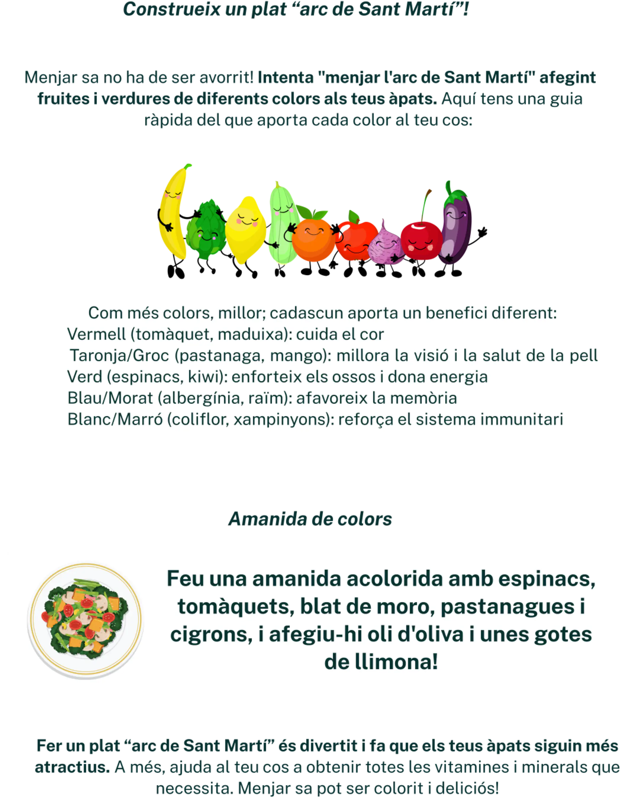 - Menjar, principalment aliments naturals i colorits per a una millor nutrició i energia.
