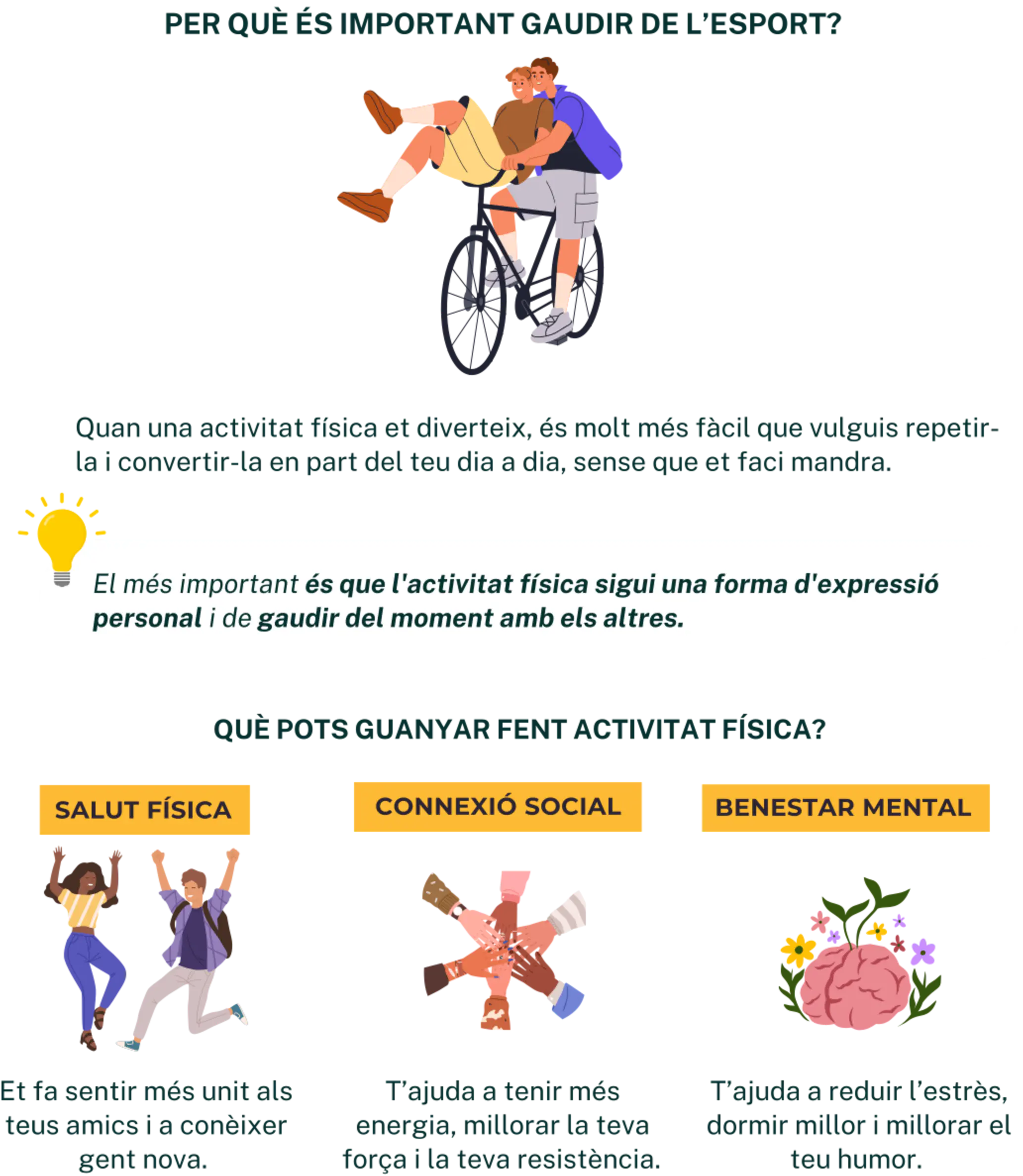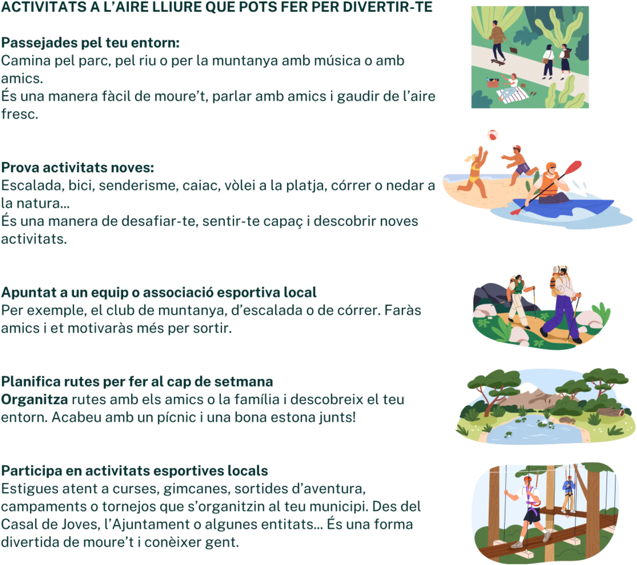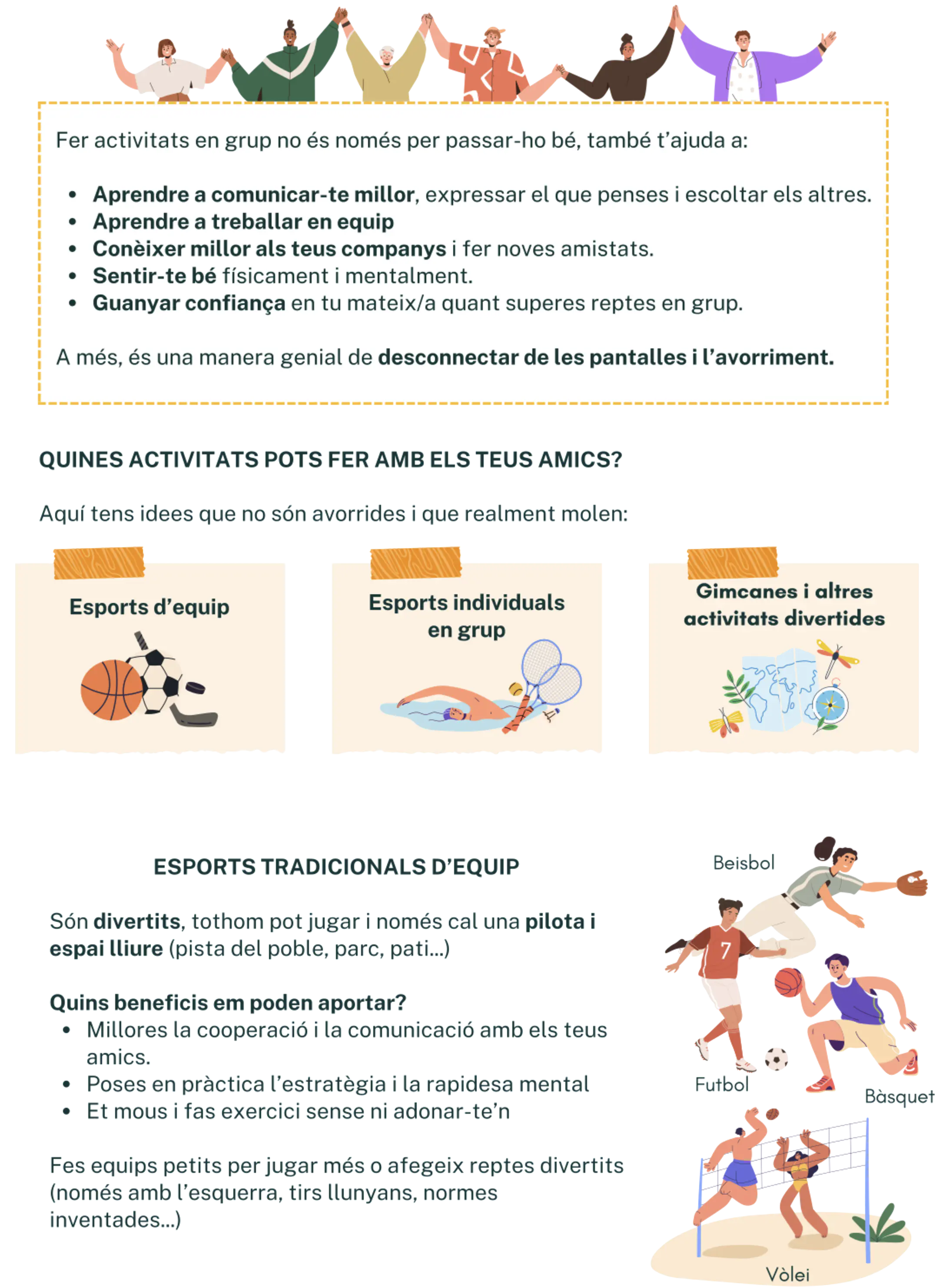 Fer activitat en grup t’ajuda a connectar, sortir de la rutina i carregar-te d’energia. Troba el que t’agrada i comparteix-ho amb els amics: el més important és passar-ho bé mentre us moveu!