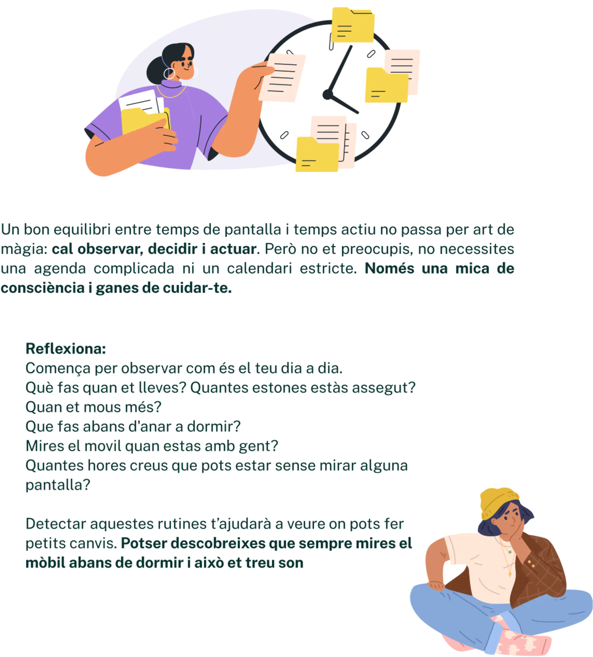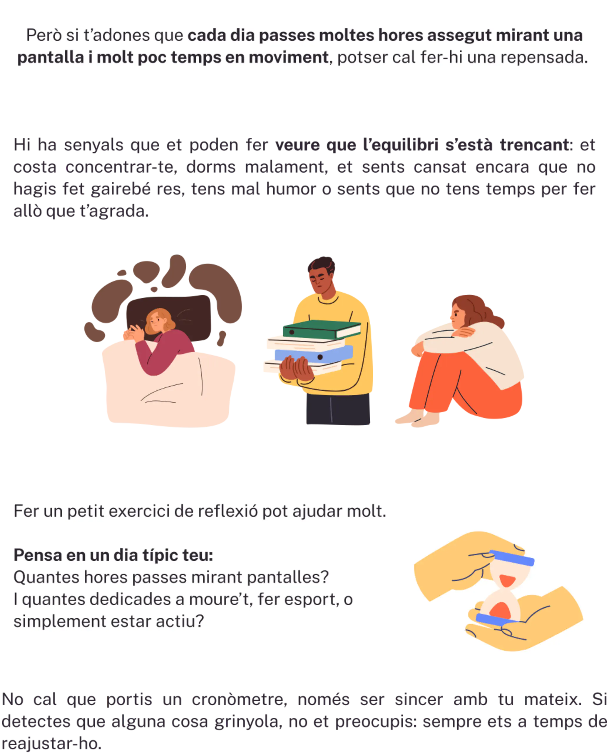 Les tecnologies no són dolentes per si soles. De fet, formen part del nostre dia a dia: les fem servir per estudiar, per comunicar-nos, per entretenir-nos… i això és totalment normal.