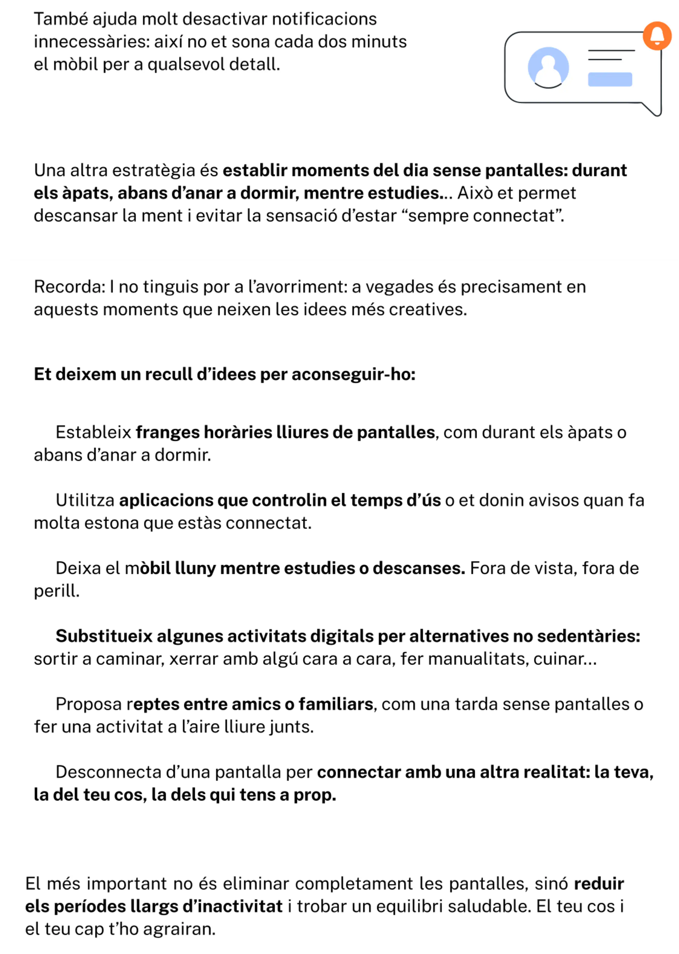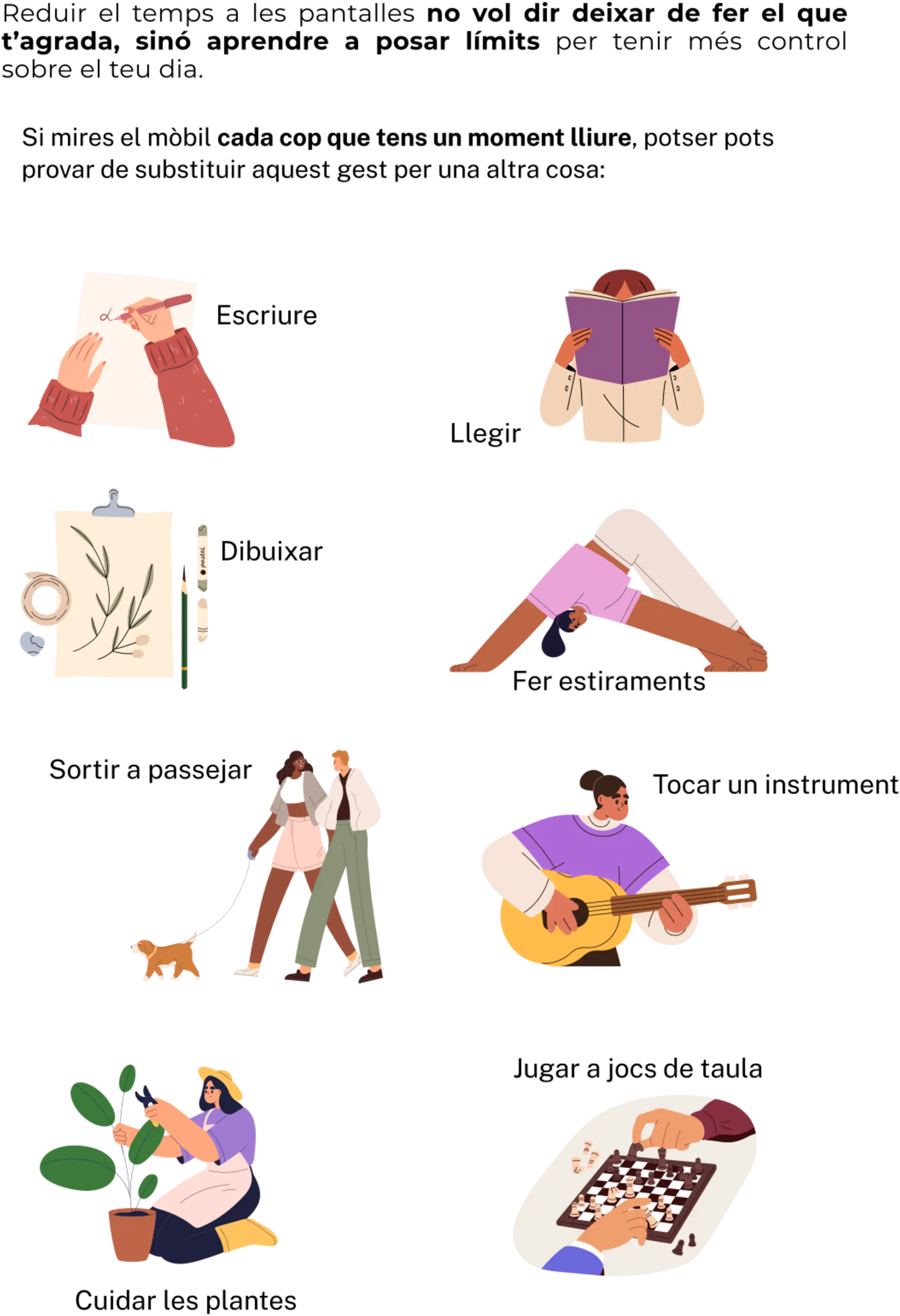El repte o objectiu no és eliminar l’ús de pantalles, sinó gestionarlo de manera conscient i saludable, integrant també moments actius al llarg del dia.