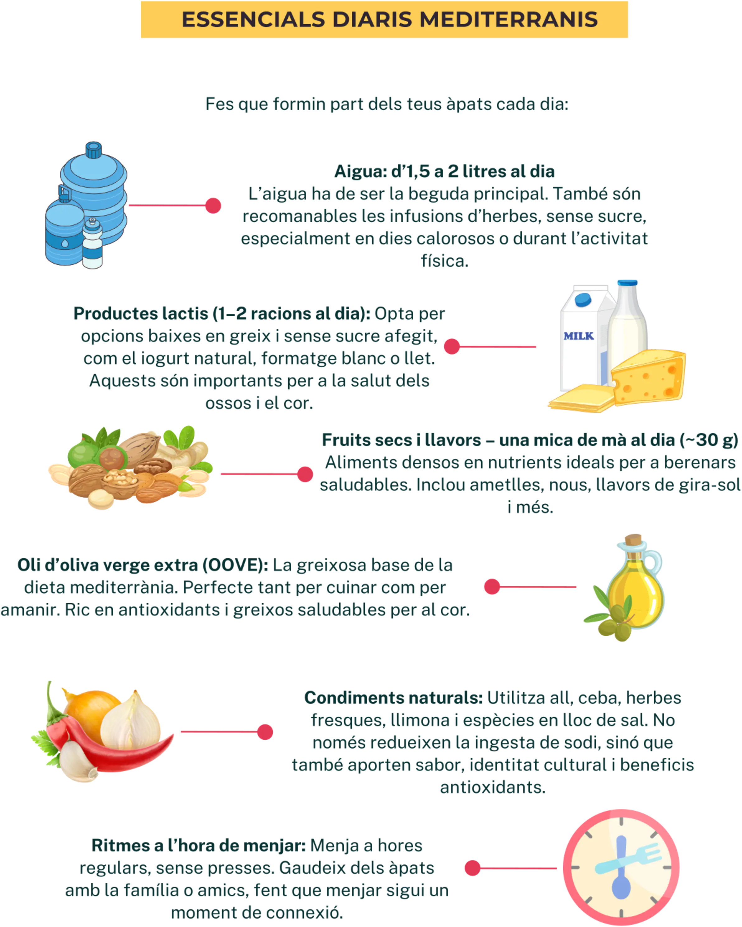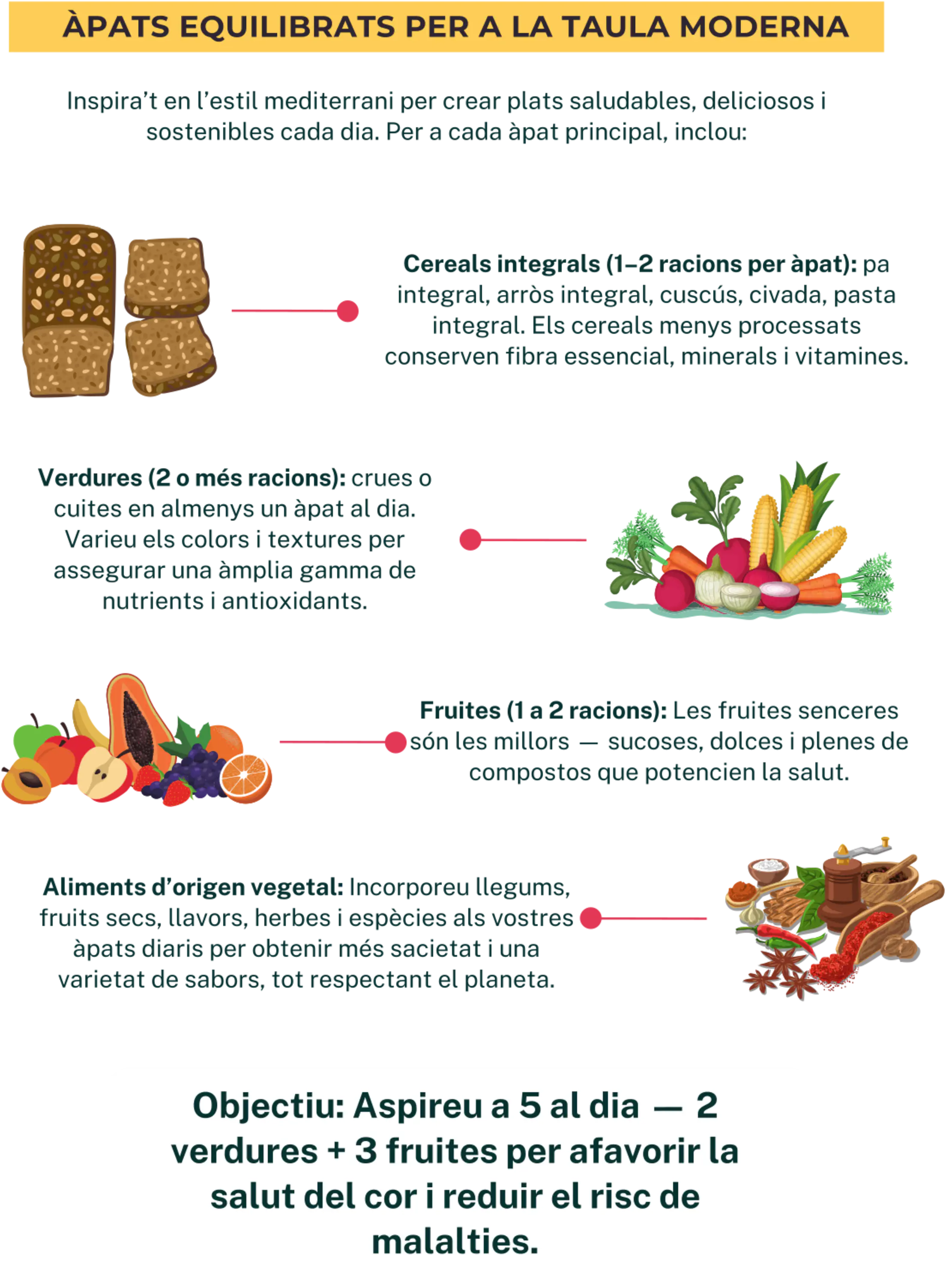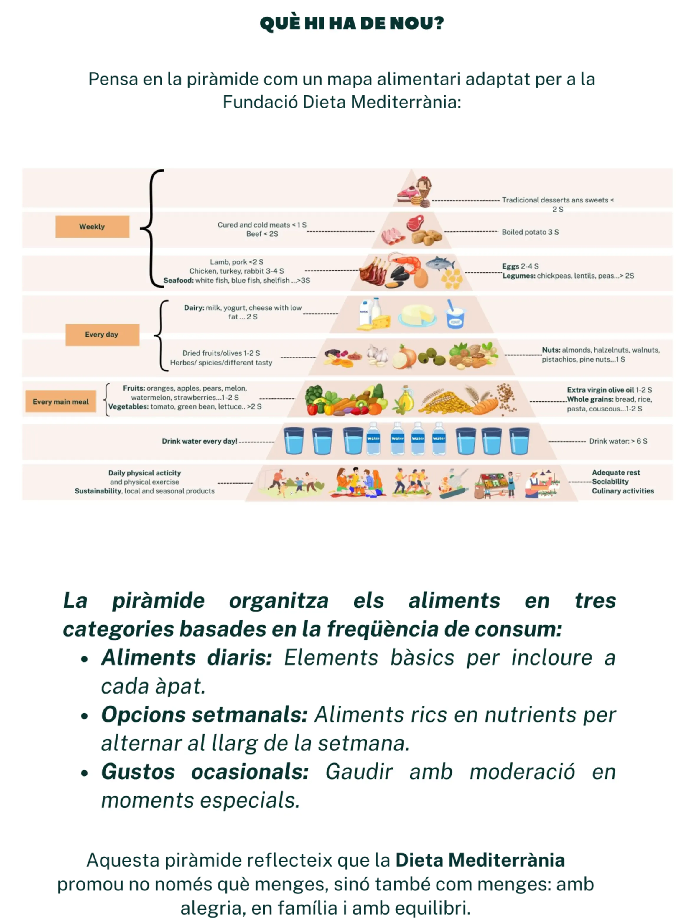La dieta mediterrània fa temps que és reconeguda pels seus beneficis per a la salut, i ara s’ha actualitzat per reflectir l’estil de vida actual mantenint les seves arrels saludables per al cor. Aquesta nova versió de la piràmide va més enllà dels grups d’aliments, incorporant qualitat, quantitat, tradicions culturals i hàbits alimentaris per oferir una visió més completa d’una vida saludable.